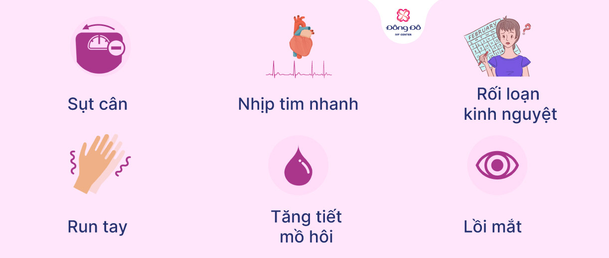 Điều này không chỉ gây ra các triệu chứng toàn thân như sụt cân, tim đập nhanh, mà còn làm rối loạn hệ nội tiết sinh sản, ảnh hưởng đến khả năng rụng trứng và chất lượng tinh trùng.
