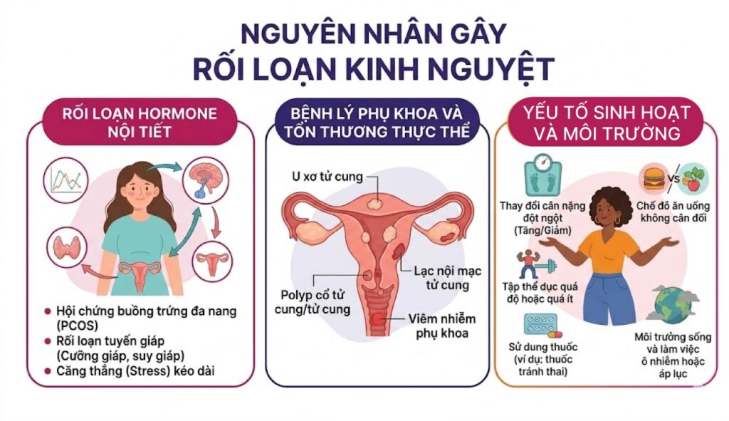 Rối loạn kinh nguyệt có thể xuất phát từ nhiều nguyên nhân, được chia thành các nhóm chính như sau:
